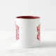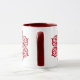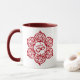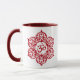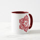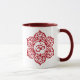 Ein Om oder ein OM entwerfen sitzt nach innen von einer stylised Lotos-Blume. Das Kreismuster wird mit einem tiefroten gefärbt, das hervorgehoben wird, um einen hellen Glanz auf der Oberfläche zu schaffen. Sechs elegantes Blätter von der Mitte des Entwurfs heraus erreichen, um ein symmetrisches Muster auf dieser modernen Tasse zu schaffen. Dieser stilvolle Entwurf ist eine auffallende Darstellung dieses geistigen Symbols.