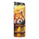 Diese ruhige Abbildung zeigt einen roten Panda, der friedlich auf einem rustikalen Holzzaun schläft. Die Szene ist Set in einem riesigen, sonnendurchfluteten goldenen Feld mit sanften Hügeln und weit entfernten Vögeln. Die warme und ruhige Atmosphäre erweckt einen ruhigen, schläfrigen Moment in der Natur.