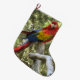 Ein wunderschönes Foto eines rau-roten Papageienvogels, der auf einem Ast vor grünem Blattwerk steht.