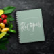 Charmantes Kochbuch in gedämpftem Grün. Personalisieren Sie mit Ihrem Namen und dem Jahr. Rezepte werden in einem schwarzen Pinselskript geschrieben, wobei ein doodled Herz den Punkt über dem i ersetzt.