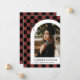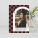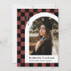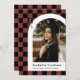 Diese moderne und einzigartige Ankündigung des Abschlusses zeigt einen dunkelrot-schwarz-karierten Hintergrund, der ein gerahmtes Foto des Absolventen in einem weißen Bogen mit dem Namen und der Schule des Absolventen unterstreicht. Eine kleine Gradationskappe wird im überprüften Hintergrund des Abschlusses des Absolventen geschickt angezeigt. Der Rücken hat einen lustigen, passenden Muster in schwarz und schwarz.