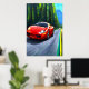 Ein roter Sportwagen, der schnell auf der Straße mit Bäumen und Bergen im Hintergrund fährt. Das ist eine künstlerische KI.