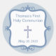 Mit diesem personalisierten runden blauen Kreuz-Kommunion/Bestätigungs-Aufkleber können Sie Ihre Gunst individuell gestalten, Einladungen oder Dankeschön-Karten Siegel oder für Geschenketiketten verwenden. Dieses zeitgenössische Design zeichnet sich durch ein blaues Kreuz aus, und Ihr Text in einem landesblauen Rahmen, Set auf einem weichen blauen Hintergrund.
