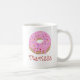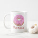 Diese Tasse ist mit mehrfarbigen Sprinklen auf einem rosa Donut versehen und kann mit einem Namen personalisiert werden. Der Schriftart ist rosa. Die Kunst und der Name sind vorne und hinten in der Tasse.