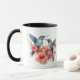 Dies ist eine hübsche Tasse für jeden, mit dem Bild von zwei rubingebeutelten Kolibris, die auf einem Zweig mit blass orangefarbenen Blüten landen. Hinter den Vogelbildern verbirgt sich eine Spur von goldenen Imitaten, Glitzer und Wirbel. Das Bild wird zweimal auf der Tasse wiederholt, wobei Ihr Name schwarz zwischen ihnen ist. Eine hübsche Frühlingsszene!