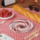 Roter und rosa Pfefferminz-Wirbels-PapierTeller