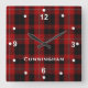Hübsche Wanduhr mit dem traditionellen karierten Muster roten, schwarzen und weißen Clan Cunningham Tartan und den weißen Punkten und den Zahlen, um den Rand. Weißer mutiger Text liest Cunningham, der kundengerecht ist, damit er alles lesen kann, das Sie wünschen. Macht eine große Geschenkidee für jedermann.