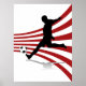 Modernes Fußball-Design mit Silhouette eines Fußballspielers, der einen Fußball auf einem Hintergrund rot-weißer Linien spielt. sgb01