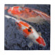 Zwei rote und weiße Koi-Karpfen (Cyprinus) auf der Wasseroberfläche