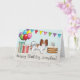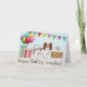 Desteis originelle Cartoon-Illustration einer rot-weißen Fellfarbe Papillon Rasse Hund. Der Hund ist in einer bunten Geburtstagslandschaft untergebracht. Es gibt einen Geburtstagskuchen mit ein paar Kerzen darauf, bunte Geburtstagsballons und ein buntes Banner sowie zwei Geschenkschachteln. Es gibt auch einen personalisierbaren Textbereich.