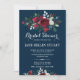 Moderne und schicke Blumendusche aus dem Winter mit hübscher roter Bordeaux- und weißer Tornese-Rose mit saisonalen Tannenzweigen und Blättern und mit weißem, modernem Schriftzeichen auf dunkelblauem Hintergrund Bitte beachten Sie, dass die dunkelblaue Hintergrundfarbe editierbar ist. Sie können die Schriftfarbe sowie die Schriftfarbe ändern, nachdem Sie die Taste CUSTOMIZE ausgewählt haben. Ideal für die Party des eleganten Brautparty.