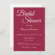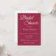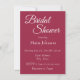 Einfache Stil, Brautduscheinladung mit einem trendigen, weinroten Hintergrund, mit dem Namen und Veranstaltungsort der zukünftigen Braut, Party, Kontakt, etc., in weißer, stilisierter Schrift gedruckt. Personalisieren Sie Ihre Einladung, indem Sie Text durch eigene Brautparty-Informationen ersetzen. Wählen Sie Ihre Einladung Papier Stil und Quantität.