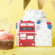 Dieses Verpackungspapier kennzeichnet einen iconic roten London-Bus mit Party Ballonen und Confetti - vervollkommnen Sie für Geburtstagsgeschenk eines Kindes.
