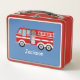 Ein niedlicher roter und blauer personalisierter Kinderfeuer-LKW-Mittagessenkasten. Vervollkommnen Sie für den kleinen Feuerwehrmann- oder Firetruckfan in Ihrem Leben!