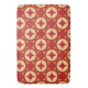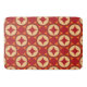 Ein künstlerisches nahtloses Muster mit roten, orangen und beigen geometrischen Formen, die miteinander verbundene runde und sternförmige Motive bilden.