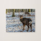 Wilde Rotwild in einer verschneiten Waldlandschaft, bei der der Hof direkt auf die Kamera schaut.