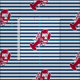 Ein roter Hummer mit Ihrem Monogramm oder Text-Set auf einem Marineblau- und weißengestreiften Hintergrund. Ein perfekter Entwurf für einen Strand oder ein Sommerhaus durch den Ozean, Hummer backen auf dem Ufer, den Wiedervereinigungen oder gerade dem täglichen Leben. Klicken Sie an das Colorfulgalshop Logo unten für mehr Spaßseeentwürfe