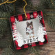 Rustic farm fresh Christmas trees, Foto von keepsake ornament. The ornament can be customized with the pet's name, the year and the foto. Red checkerboard plädiert background with rustic pine trees and snowflakes. Die Pet's name is displayed on white dog bone. Artwork by Moodthology Papery