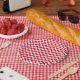 Party-Papiere-Teller für das Prüfpappe, rot-weiß, kariert. Ideal für Picknick, Grillen, Grill, rustikale Hinterhof-Party, Sommer- und Feiertagsfeiern, Geburtstage, Delis und Bäckereien. Modern, Retro, Abendessen, Picknickstil, niedliches und lustiges Schachbrett, Schachbrettgrafik.