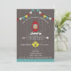 Eine im Freien thematische Geburtstagseinladung mit einer Illustration einer Laterne aus rotem Camping, Zickzack Bundings, Ahornblättern und einem Pfeil. Hintergrund ist Holz . Gegenüber ist die Seite rosa Zickzack. Achten Sie auf die Koordination von Artikeln in Jill's Paperie.