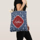 Ein blaues und weißes Ankermuster der Marine im rautenförmigen Hintergrund. Auf dem Hintergrund befindet sich ein roter, stylischer Rahmen mit Quarrefolienform mit individualisierbaren Namen und Monogramm-Vorlagen.