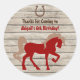 Personalisiertes Rot-Braun-Silhouette-Pferd mit braunen Hufeisen auf einem Stallholz Geburtstagsparty danke Ihnen Aufkleber. Dieses Design ist perfekt für Mädchen und Jungen.