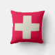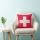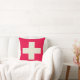 Kissen mit beige Querentwurf auf rotem Hintergrund.