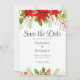 Diese klassische Weihnachtshochzeit in Rot und Grün Save the Date bietet helle poinsettia Blume am unteren rechten Rand Ihrer Einladung und heilige Beeren und Grün auf dem oberen links. Eine festliche und helle botanische Einladung für eine Hochzeit mit elegantem Drehbuch.
