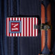 Klassische rote und weiße Streifen mit einem patriotischen roten, weißen und blauen Monogramm auf dem vorderen und festen Blau mit weißem Text auf der Rückseite. Personifizieren Sie das Monogramm auf der Front mit Ihrer Wahl der Initiale und der Kontaktinformationen über die Rückseite.