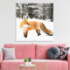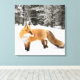 Roter Fuchs mit buschigem Schwanz in kaltem Weißschnee. Hoher grüner Pinienwald im Hintergrund. Schöne Natur.