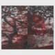 Spektakuläre rote Kirschblüten aus einer alten Eiche