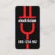 Ein ganz schwarzes Cover wird durch einen übergroßen roten Power-Stecker hervorgehoben, in dem sich oben Ihr Firmenname "Elektriker" befindet. Dieser Power-Stecker geht weiter, um eine Glühbirne auf der Kartenrückseite Power. In der Nähe der Kartenbasis liegt die Telefonnummer. Über dem Power befindet sich eine Glühbirne, die von der Vorderseite aus mit einem Power versehen wird. In dieser Glühbirne haben Sie oben den Firmennamen, gefolgt von den Kontaktdaten mit Ihrem angesehenen Namen. Das ist ein großartiges minimalistisches Design für Elektriker.