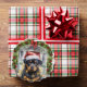 Eine Weihnachtsschmuckkarte mit Rottie Dog in Weihnachtsmannmütze- und Ferienlichtern stand vor einer weihnachtlich dekorierten Haustür. Bräunliche und weiße Rottweiler Hundeschutzkarten, eine einzigartige Alternative zu einer traditionellen Ricaso-Karte - fügen Sie Ihren eigenen Text hinzu