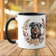 Ein hübscher Herbstkranz in den Farben Zimtbraun, Bräune und Creme umgeben das Aquarellbild eines wunderschönen Rottweiler Hundes. Das Bild wird zweimal auf der Tasse gedruckt, wobei der eigene Text dazwischen liegt.