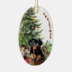 An der Vorderseite dieses Holiday-Ornaments befindet sich das Bild eines bezaubernden Rottweiler-Welpen, der in seinem Korbbett aus Korbweide vor einem verzierten Weihnachtsbaum liegt. Kurzer roter Text an der Seite sagt "CHRISTMAS". Auf der Rückseite steht rot und grün "MERRY CHRISTMAS", und es gibt zusätzliche Textfelder, die Sie nach Ihren Wünschen anpassen können.