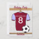 Rotweinfußball Jersey mit dem Fußball, der in einem Umkleideraum völlig kundengerecht mit Ihrem eigenen Namen und Zahl hängt. auf der Änderung der Rückseite gerade führt die Details an Ihrem eigenen Party einzeln auf, um einzigartige Fußballgeburtstags-Party Einladungen zu schaffen. Große Party Einladungen für irgendeinen Fußballspieler, Fußballmädchen, Fußballmamma oder Fußballfan. Wir können dieses Produkt in irgendeiner Jersey-Farbkombination gerade mit uns durch den giftsbonanza Speicher vor Kauf in Verbindung treten lassen.