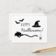 Desteis einfaches Halloween-Silhouette-Design mit einem Hexenhut, einem Besen, zwei Fledermäusen und Spinne zusammen mit einem Text, der lautet: "Happy Halloween!". Die Farben des Designs können nach Wunsch geändert werden.