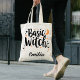 Moderne Halloween-Taschengestaltung mit "Basic Hexe"-Text in schwarzer Kalligraphie-Stil Typografie. Macht ihr das personalisiertste Halloween-Geschenk - eure Freundin, Schwester oder sogar eure Nachbarin! Perfekt, um sie sich ganz besonders zu fühlen, boo