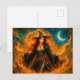 Eine mächtige Hexe hebt ihre Arme, umgeben von Flammen und einem Halbmond im Nachthimmel. Fantasy-Kunstwerk voller Feuer und Mysterien.