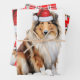 Ein bezaubernder Rough Collie Hund ist bereit für die Urlaubssaison mit einer niedlichen Weihnachtsmannmütze und gepaart mit einem Rottaufenthalt kariert auf diesem Set der Geschenkpackung für den Hundeliebhaber.