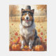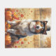 Ein Aquarellbild eines fröhlichen Hundes inmitten eines Haufen lebendiger Herbstlaub, umgeben von winzigen Kürbissen und verstreuten Eichhörnchen. Der Hund trägt einen kleinen Pilgerhut und strahlt vor Freude aus, um den Geist des Erntedanks zu erfassen. Im Hintergrund sorgen weiche Erntefelder und goldfarbene Bäume für eine friedliche Landschaft. Die sanfte Struktur und die warmen, gedämpften Herbsttöne verleihen der Szene ein gemütliches, nostalgisches Gefühl, das perfekt ist, um die Schönheit der Saison zu feiern.