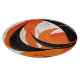 Rundschneider werden in einem farbenfrohen abstrakten Kunstdruck gezeigt. Die Farben sind schwarz, orange und weiß. Passen Sie dieses Objekt an oder kaufen Sie, wie es ist. Bild
