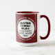 Round MAROON double image frame Large custom Combo Mug for photo or logo, 15 oz., 3.4" diameter x 4.5" high, with MAROON background double image frame (two individually customizable design areas) providing maximum coverage of the mug in MAROON, plus personalized text template optimized for the COPPERPLATE BOLD font (you may need to slightly adjust the curvature and position of the text if changing font style or size). See store for more templated font options. The background color has been chosen to closely resemble the combo mug inside and handle color but may not match exactly, due to the difference between printing and enamel tones.