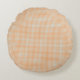 Round pillow with a small checkered pattern in orange and white. It is shown from the front and back, conveying a cozy and warm feel.