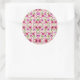 Round sticker design featuring vibrant pink flowers and green leaves on a white background. The sheet displays five identical stickers, conveying a floral, cheerful tone.