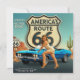 A bold, vintage-inspired Route 66 design featuring the iconic highway shield, a blue classic convertible, and a glamorous pin‑up pose set against a Southwest desert backdrop—perfect for road‑trip lovers, Americana fans, and retro garage décor