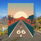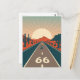 Erleben Sie den Nervenkitzel der offenen Autobahn mit dieser Route 66 USA Vintage Reise-Postkarte mit einem Retro-Motorrad-Kreuzfahrt durch kühne geometrische Landschaften. Dieses von der Nord- und Südamerika-Klassik und der Freiheit der Autofahrten Inspirierte, kontrastreiche Design ist ideal für Motorradfreunde, Touristen und Liebhaber Vintager Reisekunst.