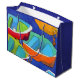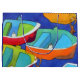 A gift bag decorated with colourful fun rowing boats on a deep blue sea.