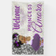 Afrikanische Amerikanische Prinzessin mit bezaubernden Afro Puff Ponytails mit dunklem lila Tutu mit weißer Rosendekönung; Diamant Ohrring und Diamanttiara auf weißem Glitzer Blumenuntergrund und Silberhintergrund. Ideal für eine lila Prinzessin-Babydusche oder Geburtstagsfeier. ©2023 Miss Sassy Party Designs