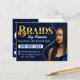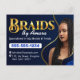 Mit unserer exquisiten Royal Blue and Gold African Hair Braiding Foto Braid Salon Postcard geben Sie sich in der Welt der Haarflechten wieder zurück. Diese Postcard ist für Haarstylisten, Hirten und Salons, die sich auf afrikanische Flechtarbeiten spezialisiert haben, konzipiert und verfügt über eine raffinierte Farbpalette in Königsblau und Gold, ergänzt durch ein faszinierendes Foto, das Ihre aufwändige Flechtarbeit präsentiert.